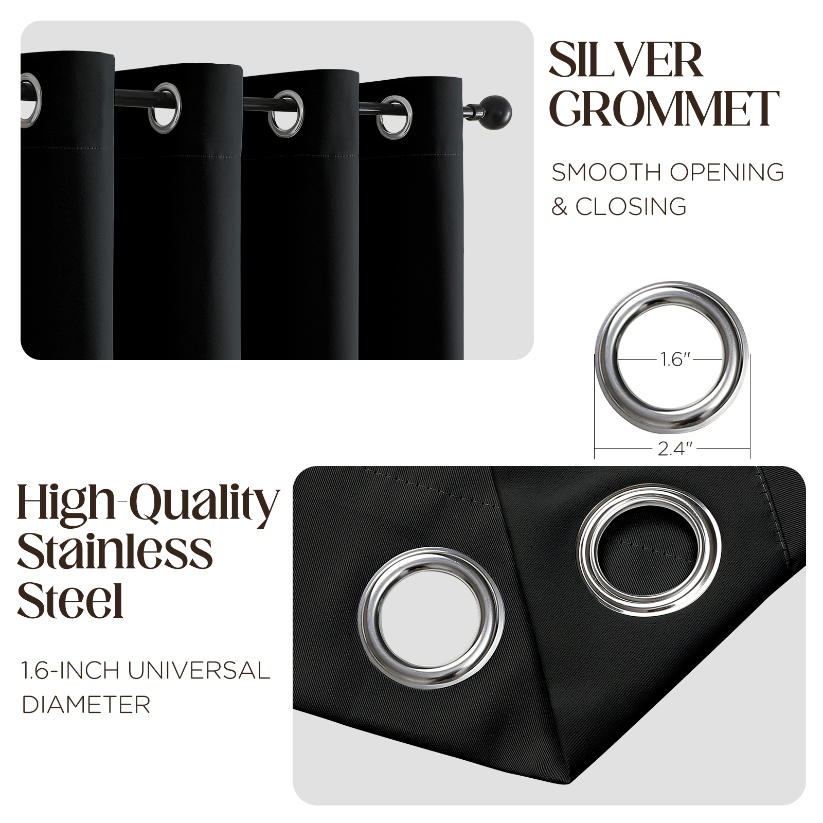 - Accurate Size: Both of curtain panels size are the same and accurate. Each panel measures 52 inches Wide x 96 inches Long. A package includes 2 panels , not lined and has 8 silver Grommets with 1.6 inner diamter